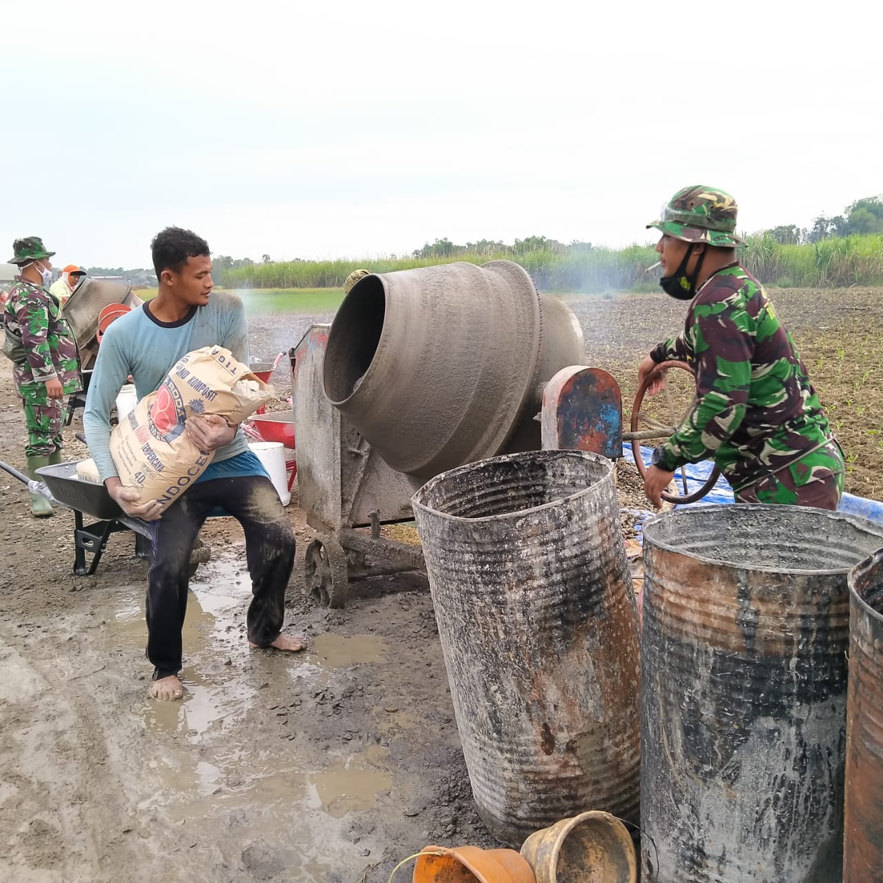 Pati – Cuaca yang panas dibawah terik matahari berdebu, berasap dan kebisingan alat mesin molen para Tim Satgas TMMD dan warga Desa Tamansari bersama-sama gotong royong penuh semangat melanjutkan pekerjaan dalam pengecoran jalan. Jumat,(25/06/2021).
