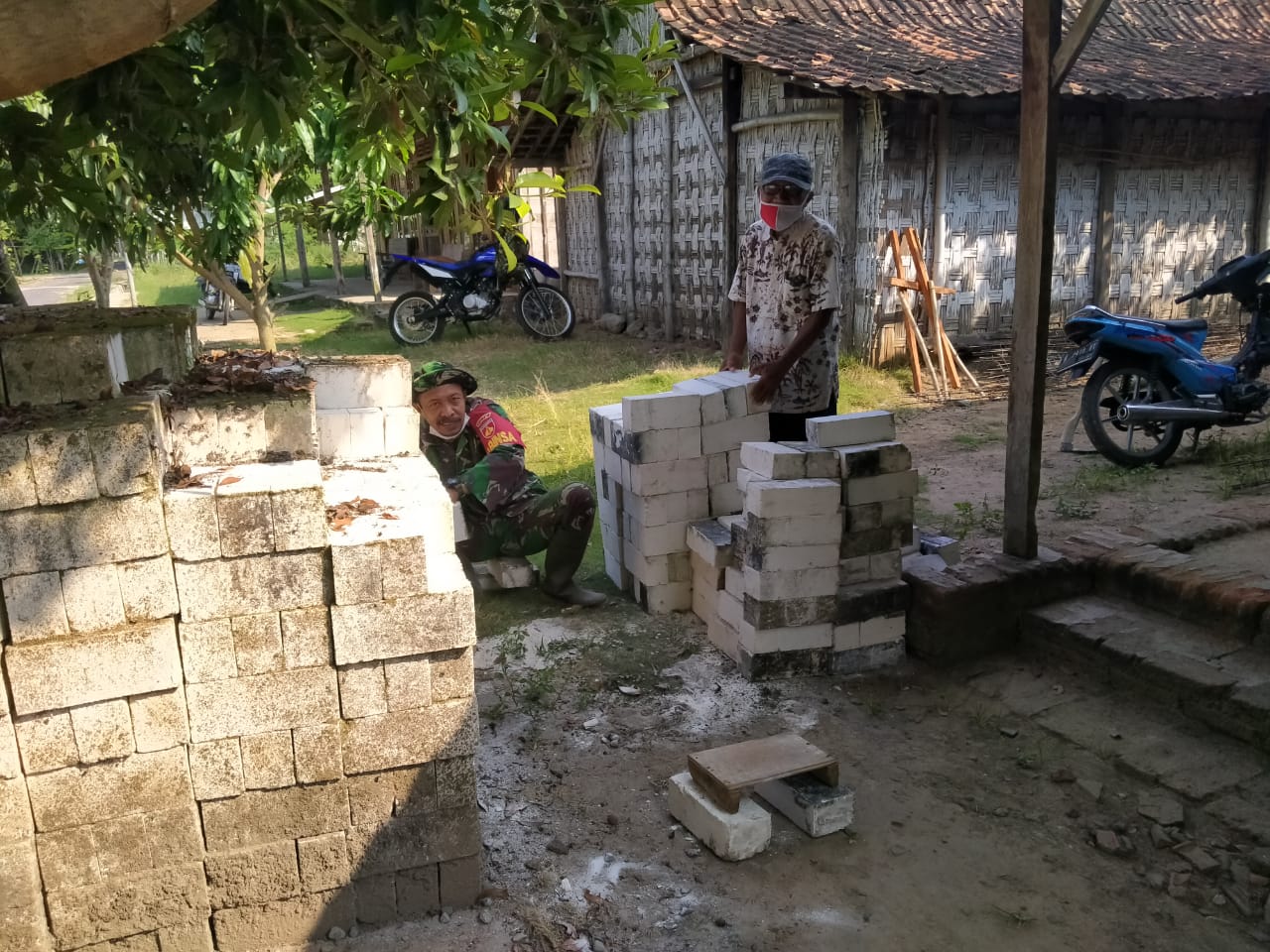 Tidak pedulikan kotoran dan debu, Sersan Dua Subakir anggota Kodim 0718/Pati nampak sedang membersihkan bata hebel untuk program Rumah Tidak Layak Huni (RTLH), ini dimaksutkan agar pemasangan bata hebelnya nanti tidak mengalami kendala, juga awet kedepannya.