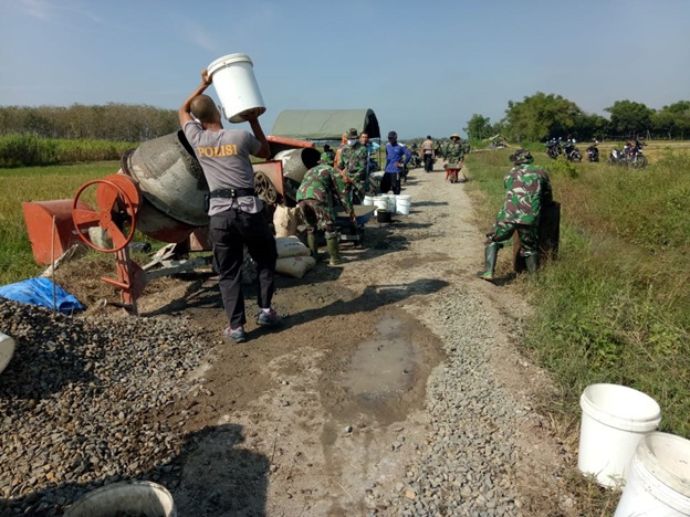 Mereka megerjakan pengecoran jalan bersama-sama tanpa menunjukan perbedaan, dengan begitu hubungan baik antara TNI-Polri akan terjaga dengan baik.