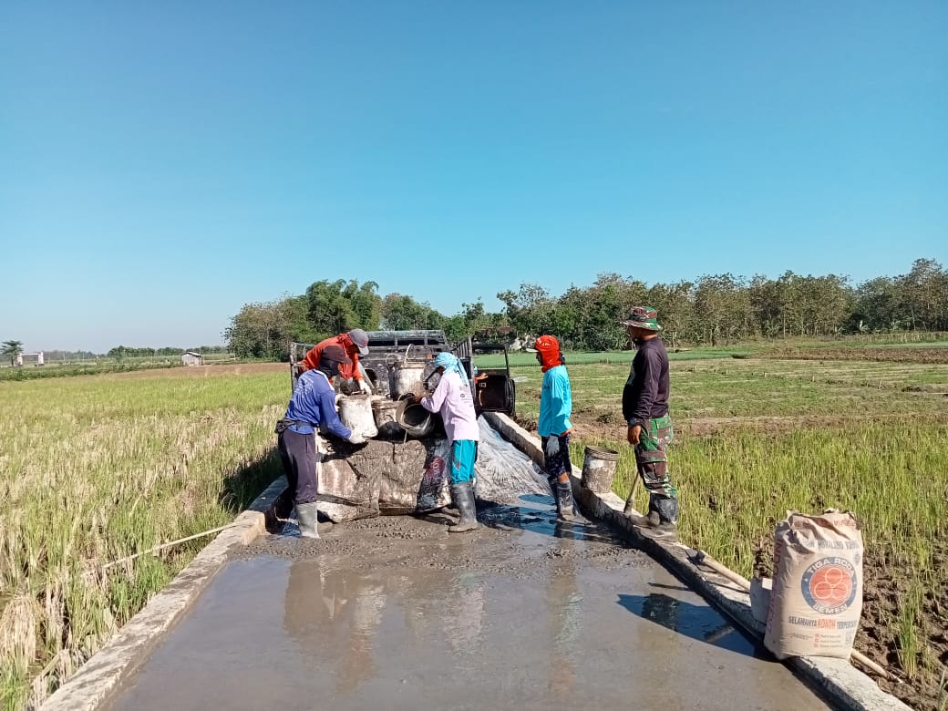 Sejumlah anggota satgas TMMD bersama masyarakat kembali menggencarkan pekerjaan betonisasi yang dibagi menjadi dua titik pekerjaan untuk mempercepat proses pekerjaan.