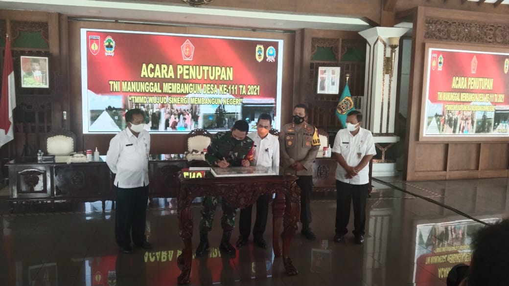 Pati – Program TNI Manunggal Membangun Desa (TMMD) Reguler ke – 111 Kodim 0718/Pati Tahun Anggaran 2021 hari ini resmi ditutup oleh Dandim 0718/Pati Letkol Czi Adi Ilham Zamani, SE, M.I.Pol bersama Bupati Pati H.Haryanto,SH,MM, M.Si di pendopo Sekda Kabupaten Pati. Rabu (14/07/2021).