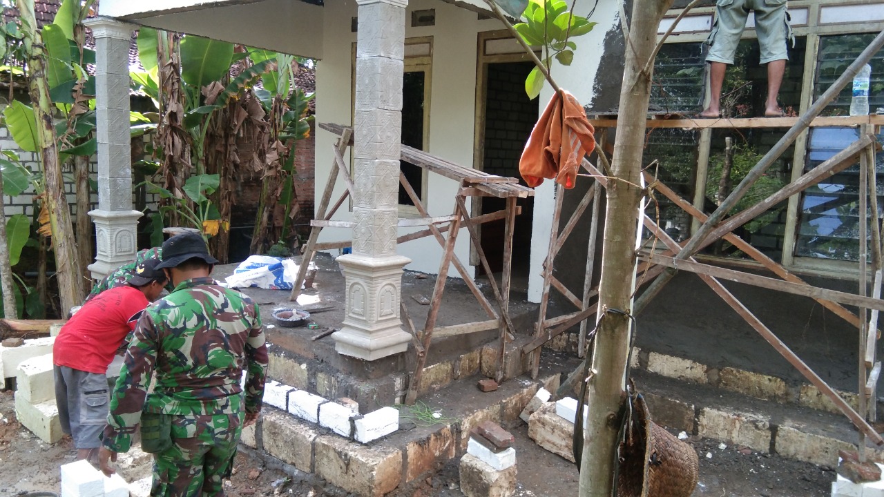 Pati – Anggota Satgas TNI Manunggal Membangun Desa (TMMD) sedang melakukan pemlesteran dinding Rumah Tidak Layak Huni (RTLH) salah satu Program TMMD Reguler Ke-111 Kodim 0718/Pati. Salah satu rumah yang direhab milik Asmuri (72) warga Dusun Kalimati RT.01 RW.01 Desa Tamansari Kecamatan Jaken Kabupaten Pati.