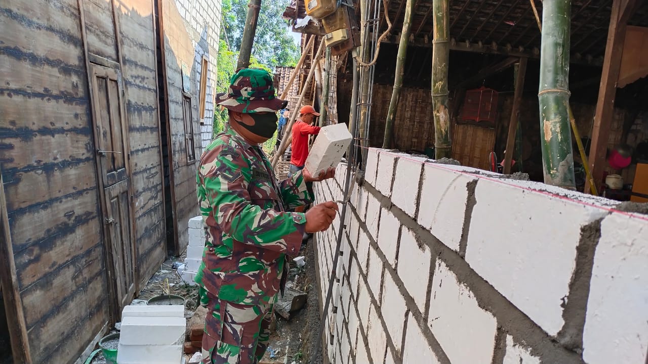 Serda Sutrisno yang keseharian bertugas sebagai Babinsa, kini di program TMMD berubah peran menjadi tukang batu membantu tenaga tukang dari warga dan pemilik rumah.