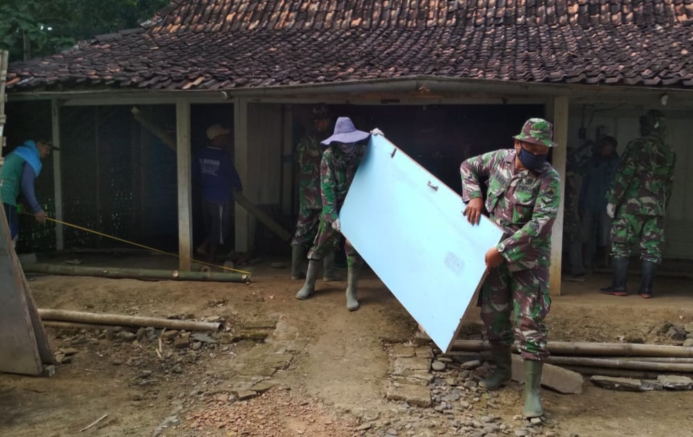 Pati – Satgas TNI Manunggal Membangun Desa (TMMD) Reguler ke-111 Kodim 0718/Pati bersama masyarakat Desa Tamansari, Kecamatan Jaken, Kabupaten Pati, terlihat bergotong royong, bahu membahu membongkar rumah milik Bapak Subekti (55) warga RT.04/01 Desa Tamansari, Kecamatan Jaken yang akan segera direnovasi. Rumah Tidak Layak Huni (RTLH) milik Subekti ini adalah sasaran terakhir 16 unit rumah yang merupakan sasaran fisik program TMMD Reguler Kodim Pati tahun anggaran 2021, Sabtu (03/7/2021).