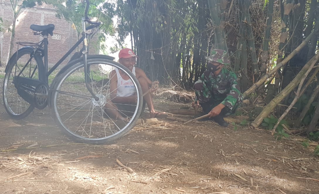 Pati – Dipenghujung pelaksanaan kegiatan TMMD Reguler ke-111 Kodim 0718/Pati, Serda Sukarji salah satu anggota Satgas TMMD melakukan kegiatan komunikasi sosial (komsos) dengan bapak Sarman (62) warga Dukuh Kalimati RT.03/03, Desa Tamansari, Kecamatan Jaken, Kabupaten Pati, di bawah rumah bambu tidak jauh dari rumahnya.