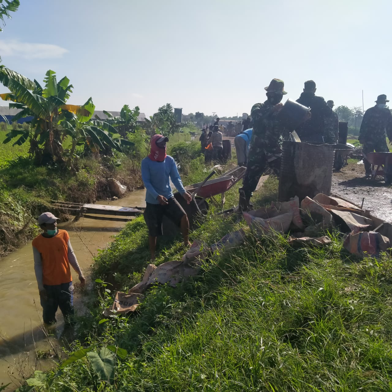 “Berhubung sumber airnya sudah mulai mendalam, maka kami mengambilnya dengan cara estafet untuk penuhi tandon air yang ada di tong. bersyukur sekali area pembangunannya disini berada didekat perairan, walau berupa parit tapi alhamdulilah airnya selalu mengalir jadinya aman,”Ujar Sertu Kusnadi, saat ditemui dilokasi.