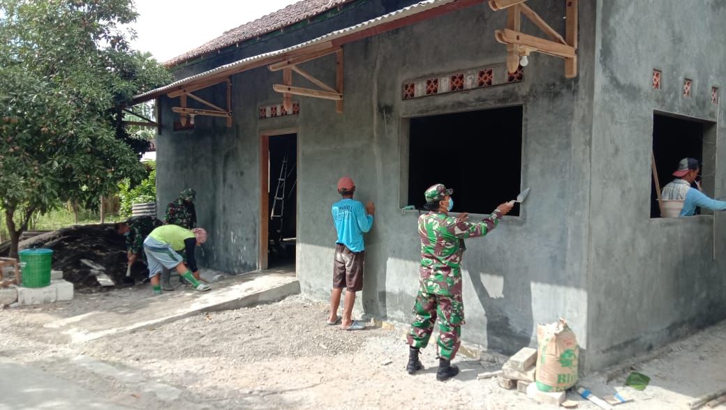 Pati – Sasaran Fisik Program TNI Manunggal Membangun Desa (TMMD) Ke-111 TA.2021 Kodim 0718/Pati, salah satunya melaksanakan rehab Rumah Tidak Layak Huni (RTLH) di Desa Tamansari, Kecamatan Jaken, Kabupaten Pati, Senin (12/7/2021).