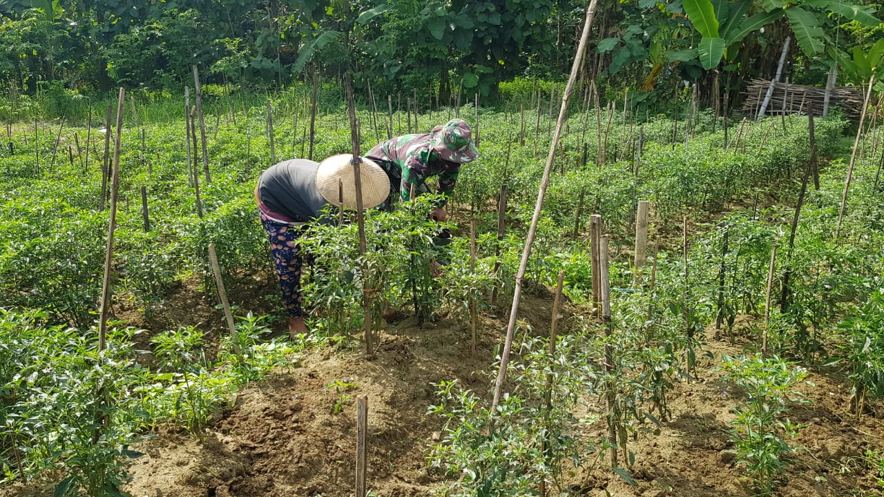 Tampak terlihat anggota satgas TMMD Kopda Rusmadi sedang membantu Narti membersihkan gulma rumput disekitaran tanaman cabai. Dikatakan oleh Rusmadi jika selepas bekerja ia membantu mencabuti rumput gulma dengan alat sederhana pada tanaman cabai milik Narti yang tak jauh dari rumahnya.