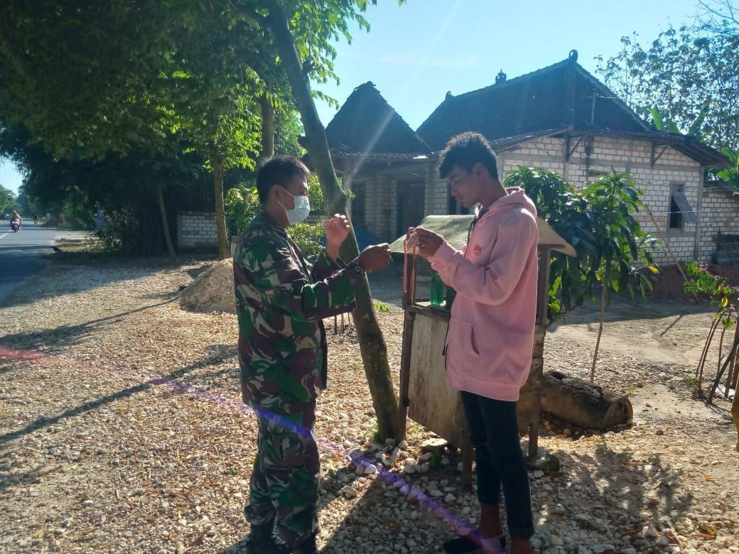 Hal ini dilakukan oleh Babinsa Jaken Sertu Zumroni, bersama anggota satgas TMMD dengan cara komsos melalui cara membagikan masker serta sosialisasi tentang wabah virus corona.