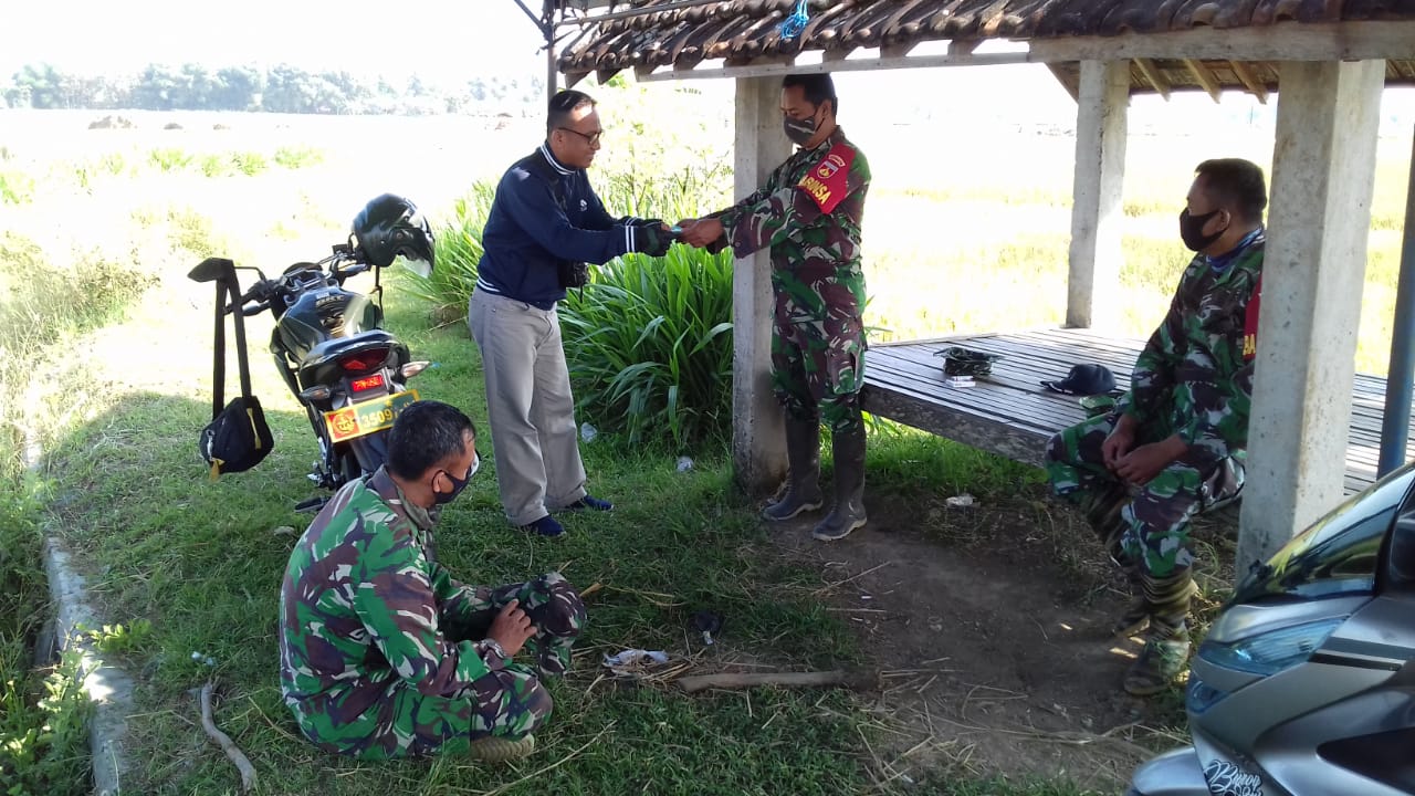 Disela kesibukan penimbunan jalan dalam masa Pra TMMD, anggota satgas TMMD Kodim Pati peduli dengan kondisi saat ini dengan membantu menyampaikan himbauan penerapan Protokol kesehatan kepada masyarakat.