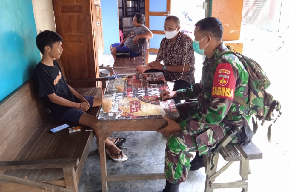 Seperti terlihat saat ini, Sertu Jumroni bersama Perangkat desa sedang memberikan edukasi dan sosialisasi kepada seorang remaja yang sedang nongkrong di bangku sebuah warung, terkait kepatuhan terhadap prokes ketika berada di luar rumah ataupun saat melakukan kegiatan,