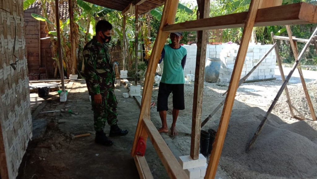 Pati – Satgas TNI Manunggal Membangun Desa (TMMD) Reguler Ke – 111 Kodim 0718/Pati, Sertu Jumroni sebagai Babinsa Tamansari membantu melaksanakan kegiatan bantuan Bedah Rumah Tidak Layak Huni (RTLH) di rumah milik Santoso (55) Dusun Pandahan RT 02 RW 02 Desa Tamansari Kecamatan Jaken Kabupaten Pati. Sabtu (5/6/2021)