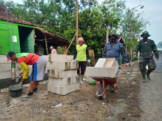 Semangat Anggota Marinir Melangsir Batu Bata Hebel dalam TMMD reg 111 Kodim Pati