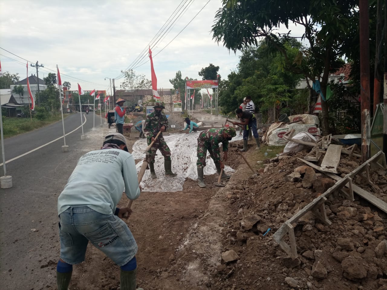 Masyarakat desa Tamansari terlihat antusias dan semangat saat melaksanakan kerja bakti membantu anggota Satgas TMMD Reguler 111 pelaksanaan sasaran fisik utama rabat beton sepanjang 1.450 meter, lebar 2,6 meter dan tinggi 0,17 meter dengan penuh kekompakan dan kebersamaan.