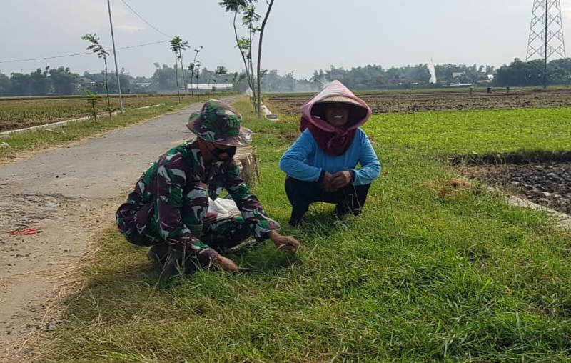 Sore itu, sepulangnya dari pengerjaan sasaran fisik TMMD berupa pembersihan jalan yang selesai dibetonisai, Serda Sukarji tampak bersama ibu-ibu yang sedang mencari rumput dipinggir jalan yang biasa dilewati anggota Satgas TMMD Kodim Pati, Senin (12/7/2021).