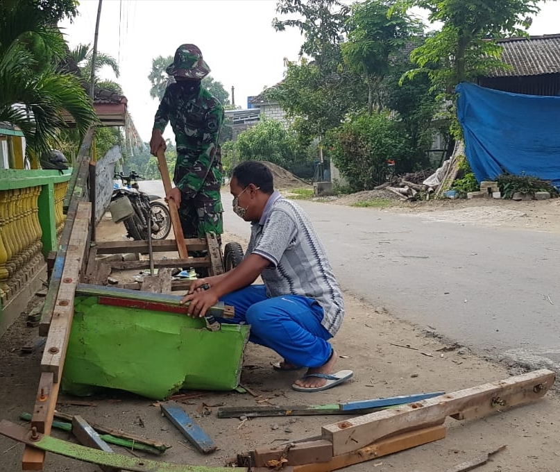 Pati – Pagi itu terlihat Serda Sukarji anggota Satgas TMMD Reguler ke-111 Kodim 0718/Pati sedang membantu Bapak Yasmin (56) warga Dukuh Kemiri, Desa Tamansari Kecamatan Jaken, Kabupaten Pati, memperbaiki Gerobak yang biasa digunakan untuk mengangkut barang dagangannya yakni kayu bakar, Jum’at (09/7/2021).