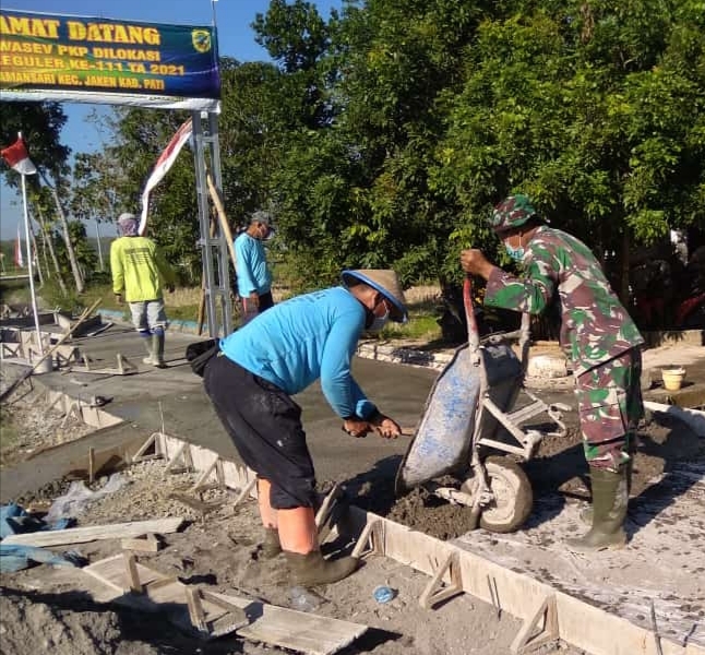 Dalam pengerjaan sejumlah sasaran fisik TMMD Reguler ke-111 Kodim 0718/Pati Tahun anggaran 2021 terbukti dengan adanya gerobak dorong itu cukup ampuh membantu pekerjaan para anggota satgas TMMD dalam percepatan pengecoran jalan. (0718)
