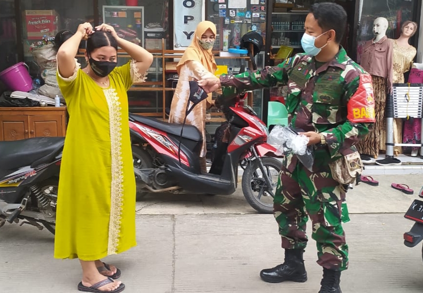Seperti terlihat, Sertu Sarno sedang memberikan maskerker kepada ibu-ibu hamil yang sedang berada di kompleks pasar tradisional Jaken. Sebelum diberikan masker untuk di pakai, Sarno juga menghimbau dan mengingatkan ibu tersebut untuk tetap mematuhi protokol, apalagi kondisinya sedang hamil.