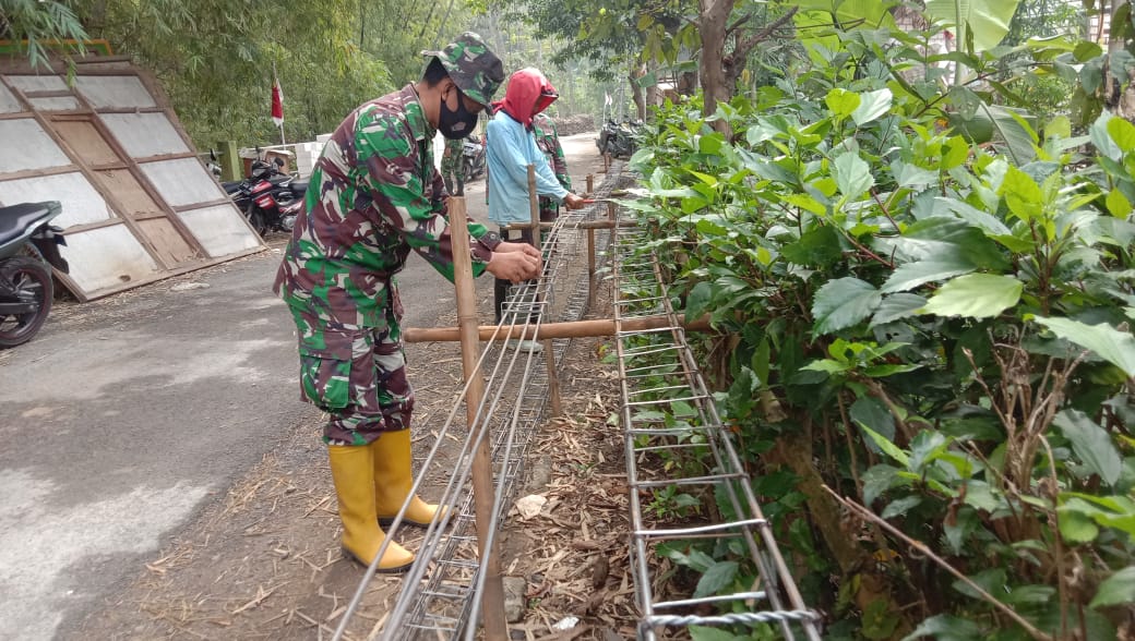 Pati – Anggota Satgas Tentara Manunggal Membangun Desa (TMMD) Reguler Ke-111 Kodim 0718/Pati, di Desa Tamansari bersama dengan warga membuat kolom begel slof yang akan digunakan untuk pondasi Rumah Tidak Layak Huni (RTLH). Rabu (23/6/2021)