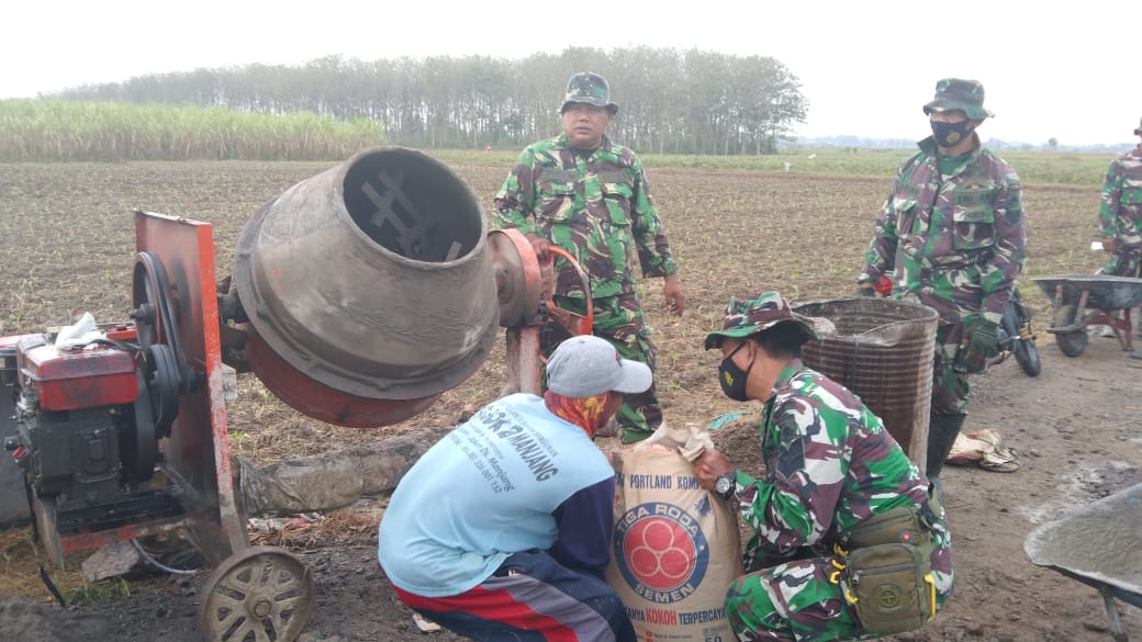 Pati – Satgas TMMD Reguler ke-111 Kodim 0718/ Pati di Desa Tamansari, Kecamatan Jaken, Kabupaten Pati Tidak pernah putus asa dalam melaksanakan tugas pengecoran jalan meraka saling bantu mengangkat ember yang berisikan pasir ataupun koral dimasukan ke molen di tambah semen dan juga air di olah di jadikan adukan sebagai bahan untuk pengecoran jalan.
