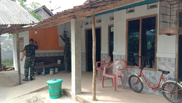 Tampak terlihat anggota Satgas TMMD Reg ke 111 dan warga setempat sedang melakukan pengecatan dinding luar rumah.