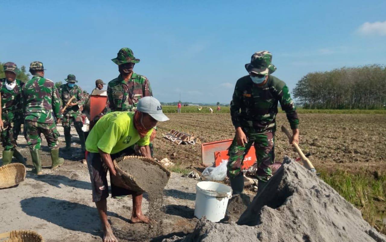 Pati – Tradisi gotong-royong dalam masyarakat kita ternyata tetap lestari hingga kini, ini terbukti pada pelaksanaan program TMMD regular 111 Kodim Pati yang digulirkan di desa Tamansari kecamatan Jaken.