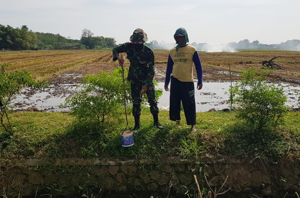Pati – Disela-sela kesibukannya sebagai anggota Satgas TMMD Reguler ke-111 Kodim Pati, Serda Sukarji menyempatkan membantu bapak Sunaryo (52) warga Dukuh Pandahan RT.02/03, Desa Tamansari, Kecamatan Jaken, Kabupaten Pati, yang sedang menimba air dari sungai untuk keperluan menyiram tanaman cabainya.