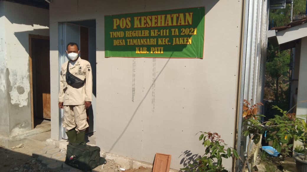 Pati – TMMD Reguler Ke-111 yang akan berlangsung selama 30 hari selama kegiatan tersebut berlangsung, Tim Kesehatan Satgas TMMD 111 Kodim 0718/ Pati selalu standby di Posko Kesehatan yang ada di Desa Tamansari,Kecamatan Jaken, Kabupaten Pati. Rabu (23/06/2021).