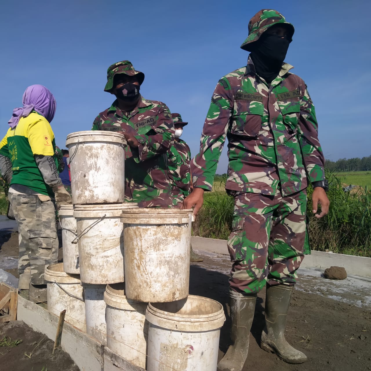 Terlihat dilokasi jalan yang menjadi sasaran utama pembangunan fisik dalam TMMD ke 111 Kodim 0718/Pati, Personil TNI dan Warga saling bahu membahu menyiapkan material untuk pembuatan adukan beton.