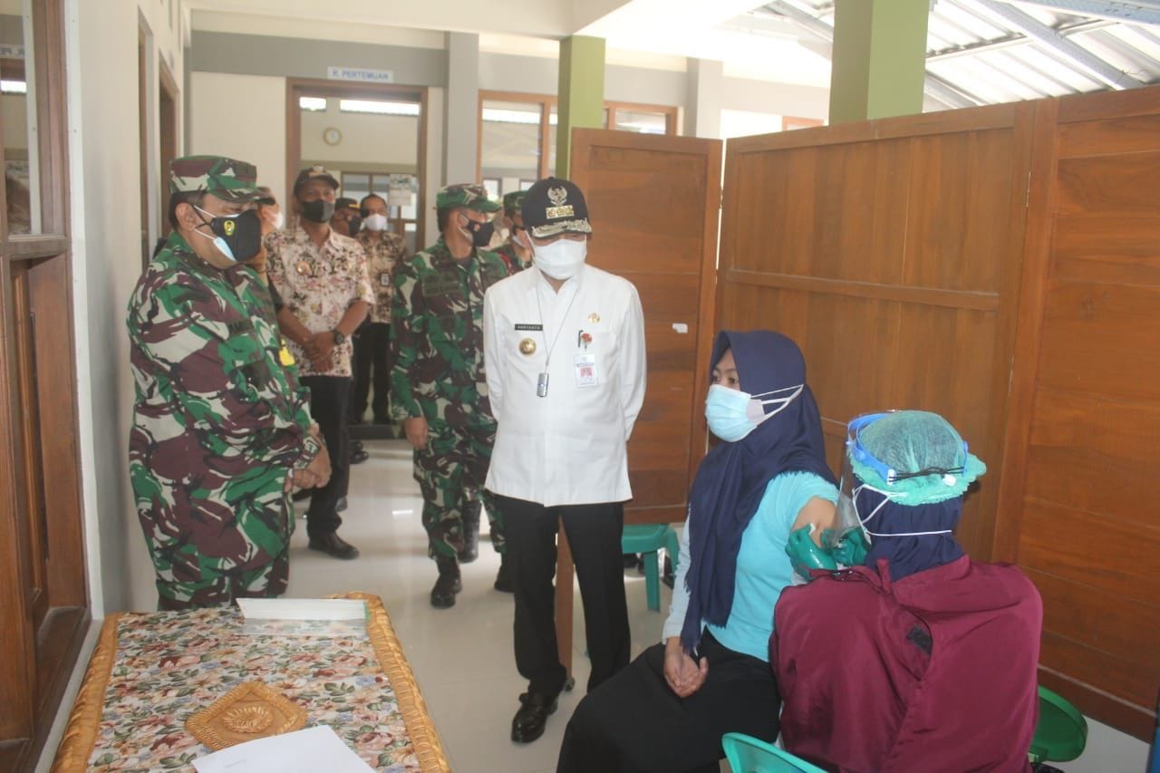 Pati – Ketua Tim Wasev JPO Mabes AD Brigjen TNI Amrizar di dampingi Bupati Pati Haryanto, Dandim 0718/Pati, Letkol Czi. Adi Ilham Zamani,S.E, M.I.Pol, dan Kapolres Pati, ikut melakukan pemantauan langsung ke lokasi pelaksanaan vaksinasi covid-19 massal yang dilaksanakan oleh Satgas TMMD Reguler ke 111 Kodim 0718/Pati, Jum’at (09/07/21).