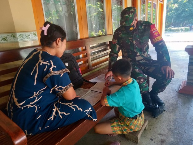 Tak segan-segan anggota Satgas Pra TMMD Reguler ke-111 tahun 2021 Kodim 0718/Pati langsung kerumah warga Desa Tamansari, dan mengajari anak-anak warga belajar.
