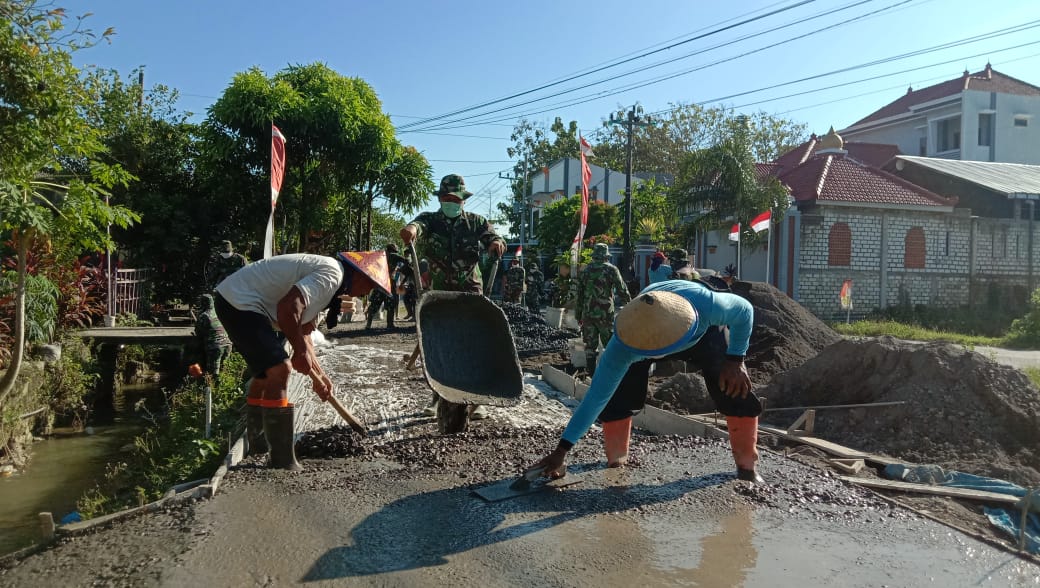 Pati – TNI Manunggal Membangun Desa (TMMD) Reguler Ke-111 Kodim 0718/Pati, pengerjaan rabat beton jalan terus dikebut anggota Satgas TMMD bersama warga masyarakat Desa Tamansari, Kecamatan jaken, Kabupaten Pati. Kamis (8/7/2021).