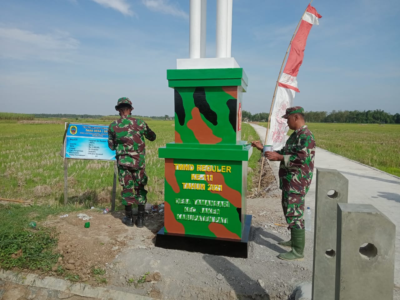 Pati – TNI Manunggal Membangun Desa (TMMD) Reguler Ke-111 TA.2021 Kodim 0718/Pati. Anggota Satgas TMMD bersama warga Desa telah menyelesaikan tugu prasasti TMMD Reguler Ke-111 sudah mencapai 100% di Desa Tamansari, Kecamatan Jaken, Kabupaten Pati