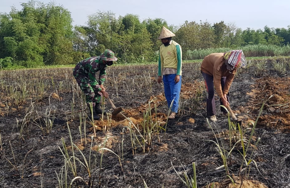 Terlihat Serda Sukarji sedang membantu Bapak Wakijan (51) warga Dukuh Kalimati, Desa Tamansari, Kecamatan Jaken, Kabupaten Pati, yang sedang bekerja mencangkul bekas tanaman tebu dilahan kebunnya.