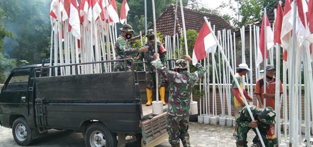 PATI – Pemasangan bendera umbul-umbul menjelang pelaksanaan upacara pembukaan TMMD Ke-111 di Desa Tamansari, Kecamatan Jaken, Kabupaten Pati terus dilaksanakan.