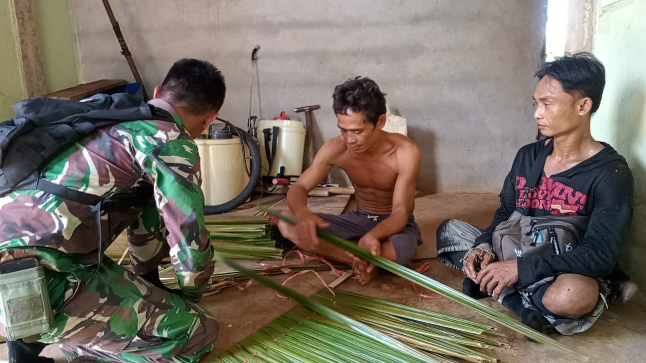Seperti yang dilakukan siang hari itu di rumah salah seorang warga yang sedang membuat anyaman atap. Dengan memanfaatkan bahan-bahan yang banyak didapat dari alam, Serda Stefelik Endry membantu mengerjakan sekaligus belajar menganyam atap pohon yang terbuat dari daun pohon sagu.
