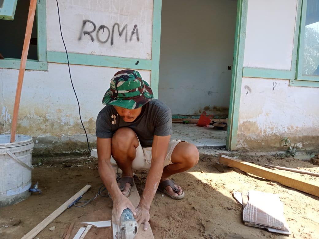 Bengkayang – Anggota Satgas TMMD Ke-111 Kodim 1202/Skw terus menyiasatin pemotongan keramik putih dengan alat khusus untuk menghasilakan pemotongan yang rapi di Desa Sentangau Jaya, Kecamatan Seluas, Kabupaten Bengkayang.