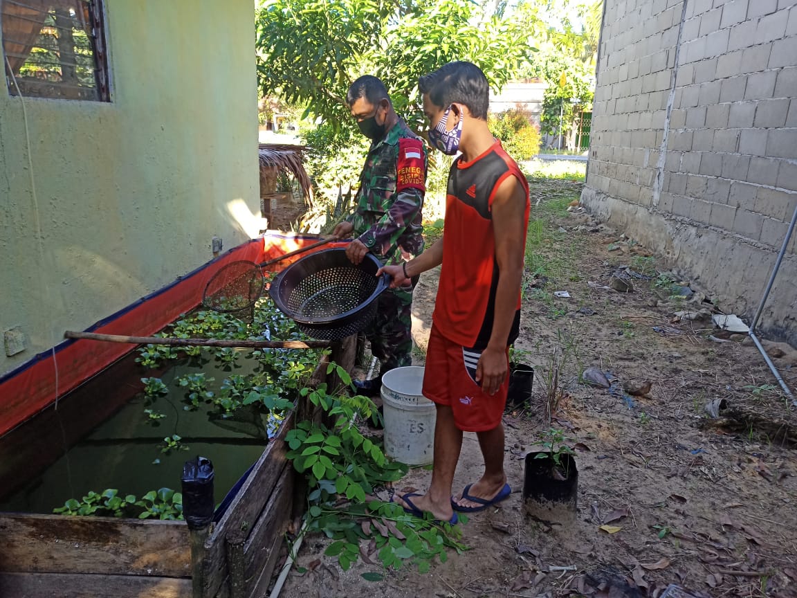 Bengkayang – Guna mendukung program ketahanan pangan di wilayah binaan , Babinsa Koramil 1202-03/sry bersama pemilik kolam menebar bibit ikan lele di desa karimunting Selasa (01/06/2021)