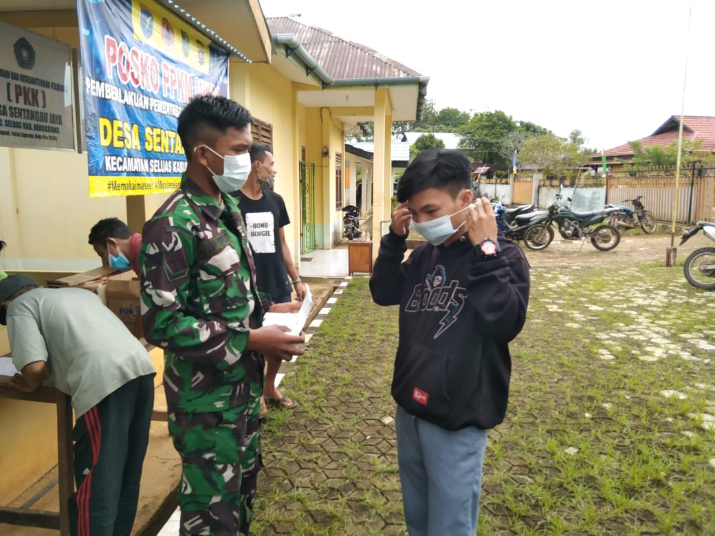 Hal tersebut dilakukan oleh anggota Satgas TMMD, Serda Galuh Setiawan yang membagikan masker kepada Bayu ( 17 ) warga Dusun Trimulya Desa Sentangau Jaya Jalan Trans Segorong Kecamatan Seluas Kab Bengkayang yang lupa tidak membawa masker.
