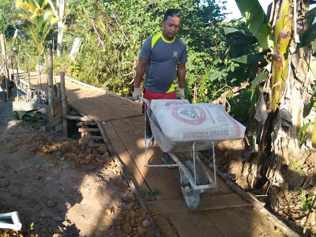 Anggota Satgas, mengangkut Semen dengan menggunakan gerobak dorong. Hal itu dilakukan untuk memperingan pekerjaan. “Dengan gerobak dorong ini membawa Semen ke sasaran lebih ringan. Apalagi dihadapkan dengan medan yang naik turun,” kata Kopda M.Chiril , anggota Satgas TMMD Kodim 1202/Singkawang.