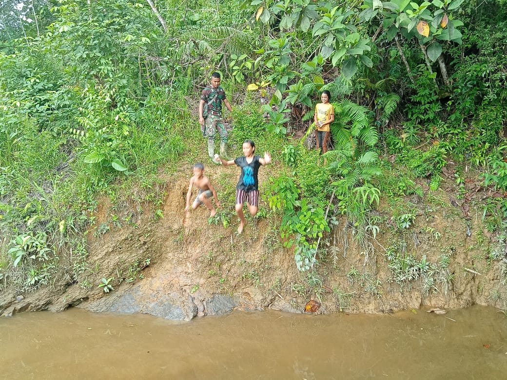 Bengkayang – Serda Dika memantau dan menghimbau kepada anak – anak yang sedang mandi di sungai agar berhati – hati di Dusun Trimulya Desa Sentangau Jaya Jalan Trans Segorong Kecamatan Seluas Kabupaten Bengkayang.