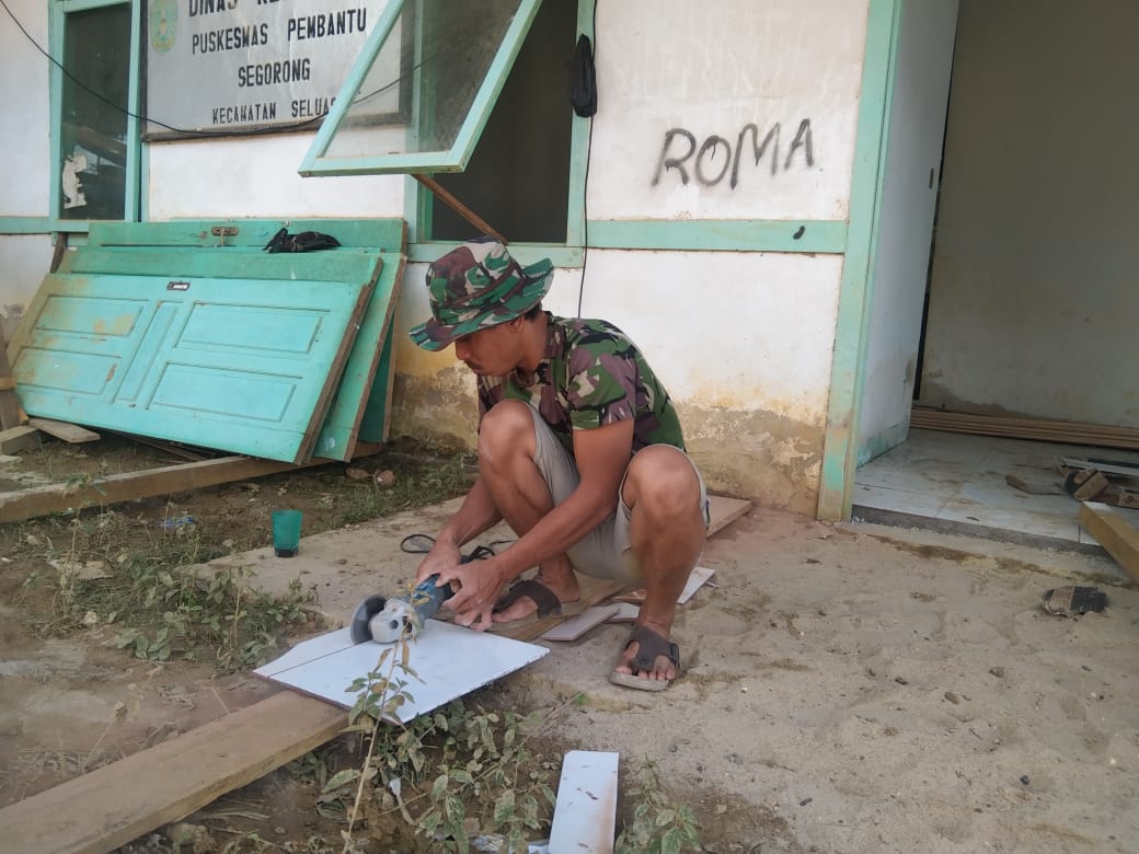 Pemotongan Keramik Guna Pemasangan Pustu Oleh Satgas TMMD Ke-111 Kodim 1202/Singkawang
