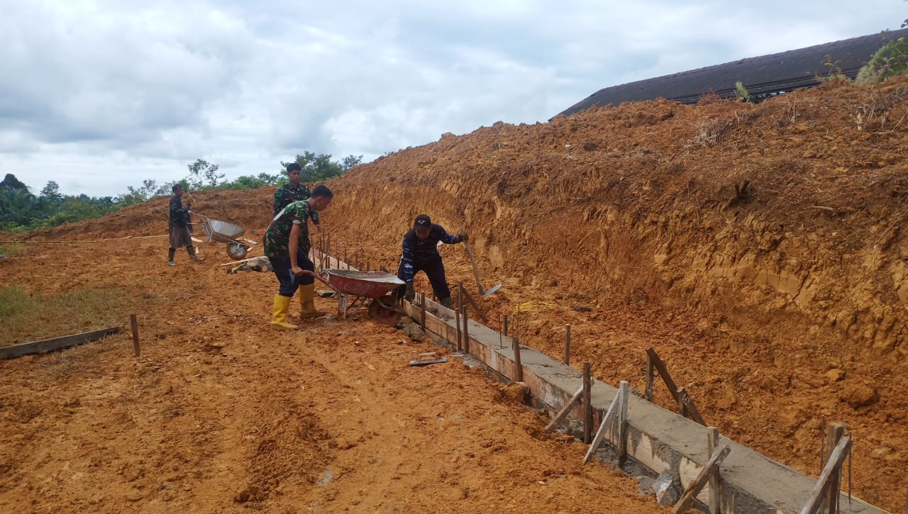Bengkayang – Setelah pondasi pagar bagian depan gereja rampung, Satgas TMMD Ke-111 Kodim 1202/Singkawang, di Desa Sentangau Jaya, Kecamatan Seluas, Kabupaten Bengkayang kini melanjutkan pengerjaan pengecoran pada pagar bagian belakang Gereja Katolik Santo Kristoforus.