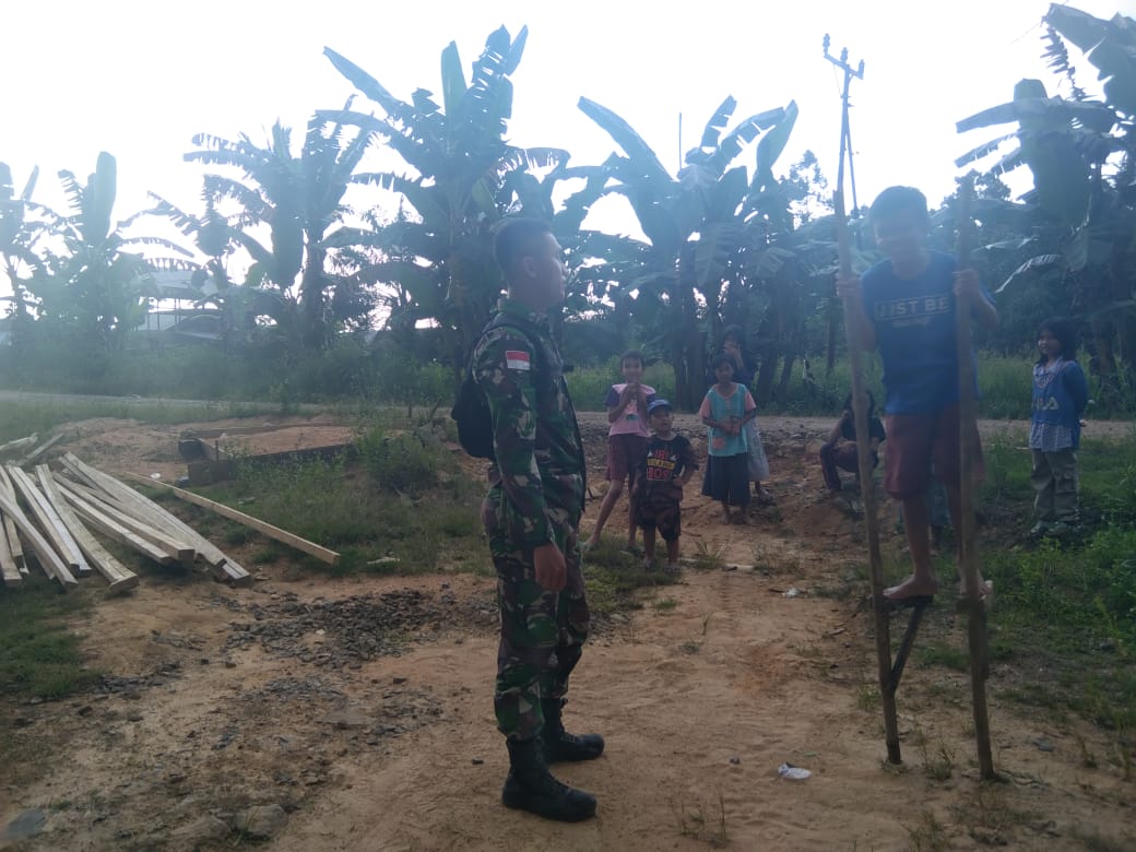 Bengkayang– Jum’at (17/06/2021) Anggota Satgas TMMD Reg-111 Kodim 1202/skw Serda stefelix Endri menggajak anak-anak Desa setangau jaya kec. Seluas kab. Bengkayang tentang permainan anak-anak yang sangat digemari pada tahun 80-an.