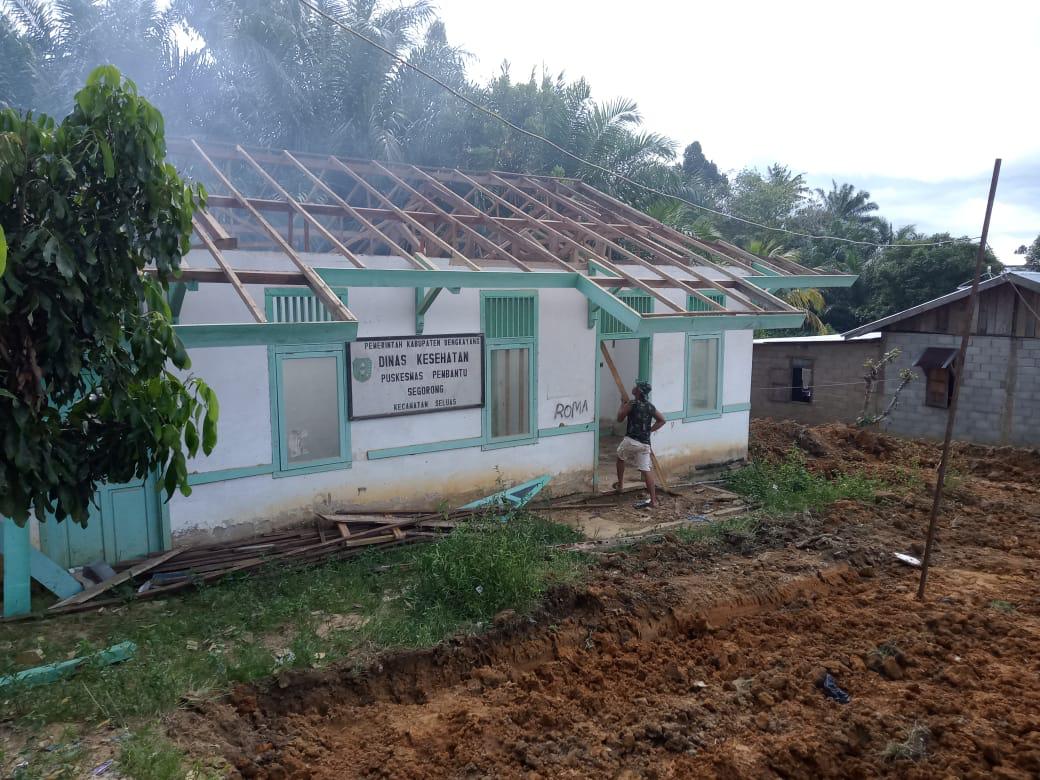 Satgas membersihkan pekarangan depan dan samping Puskesmas, menggunakan peralatan, seperti mesin pemotong rumput, cangkul, dan parang. Tidak hanya memotong rumput yang mulai tumbu besar menjalar dan menutupi sebagian bangunan Puskesmas, Anggota Satgas juga membersikan sampah plastik dan dedaunan yang berserakan sekitar halaman Puskesmas tersebut.
