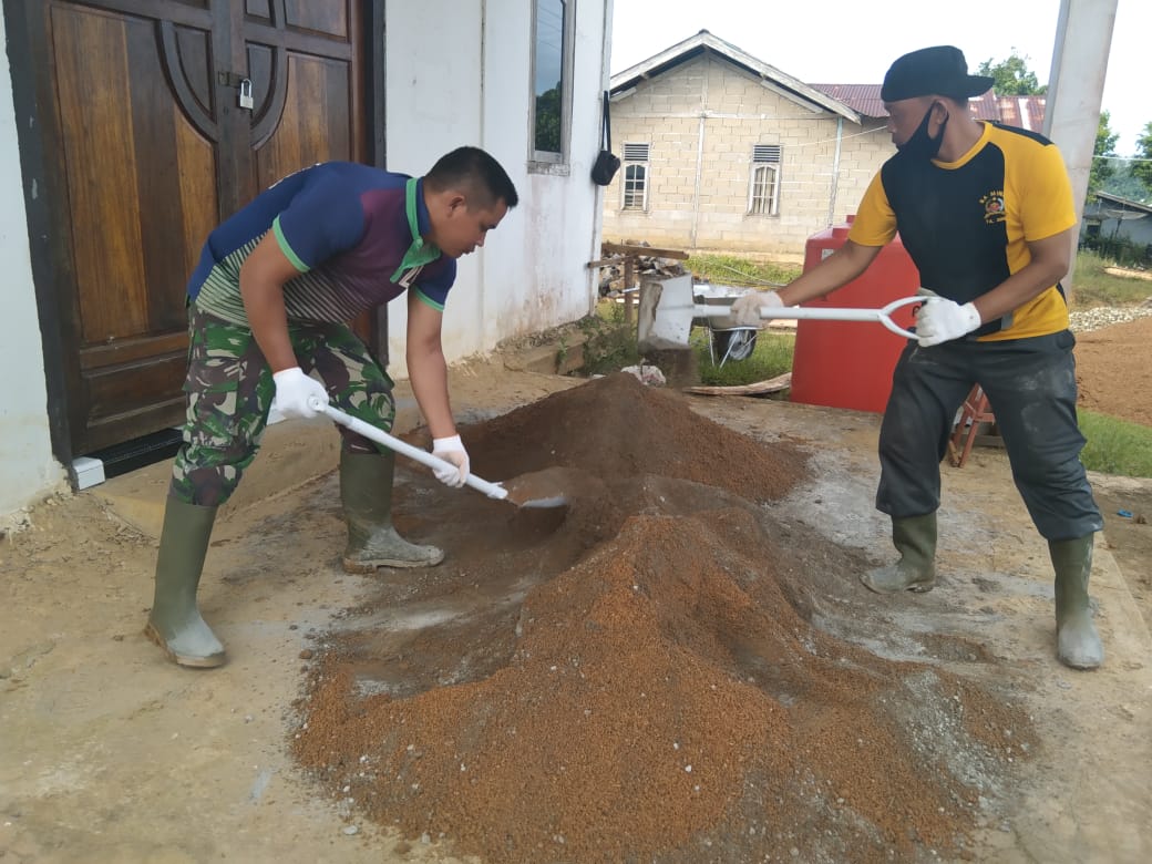Bahkan prajurit tersebut juga turun langsung mengangkut material hingga Pengadukan adonan semen.