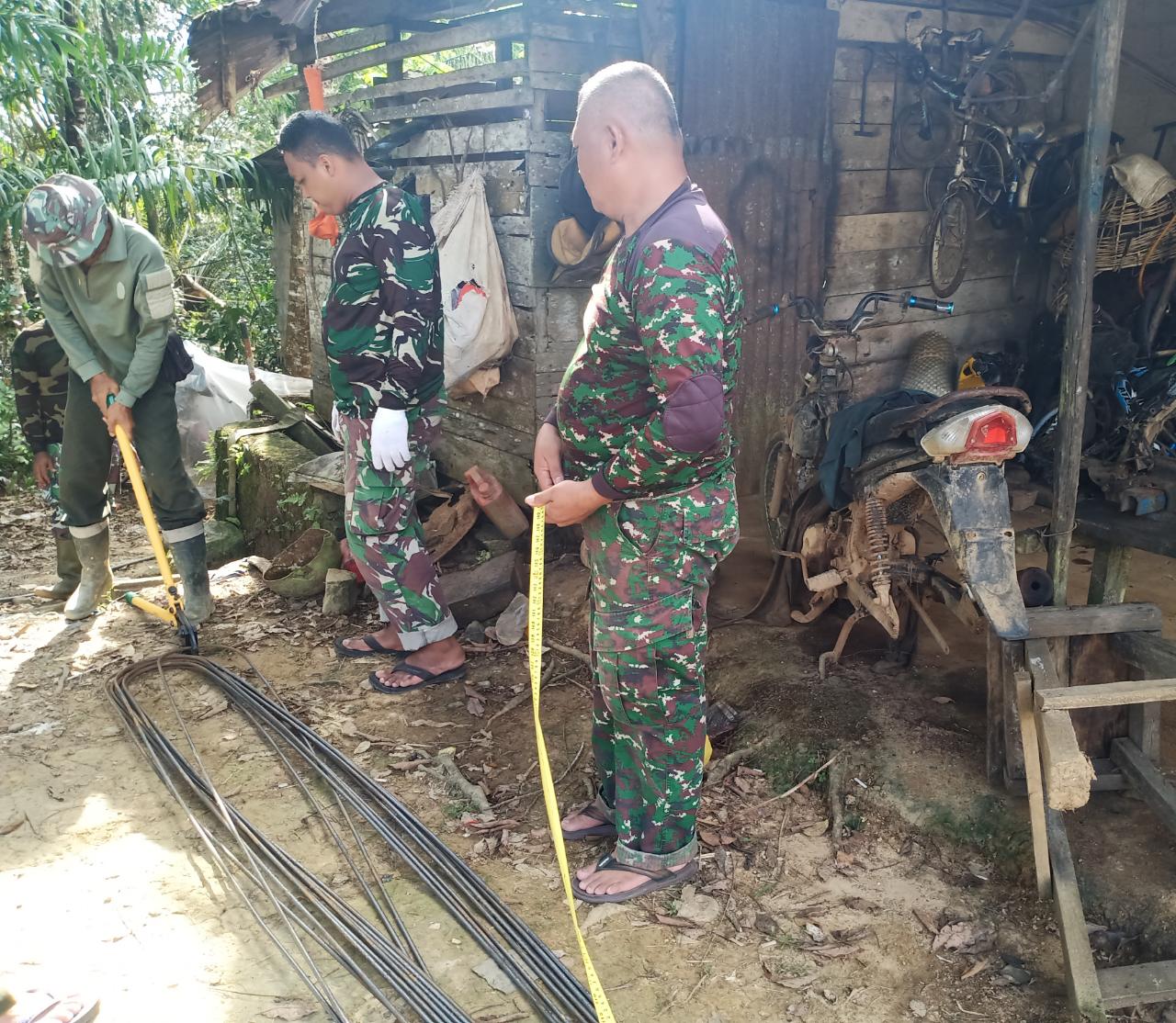 Satgas TMMD Ke 111 Kodim 1202/Skw Rangkai Kawat Besi Untuk Kerangka Cor Pondasi Pembangunan Jembatan