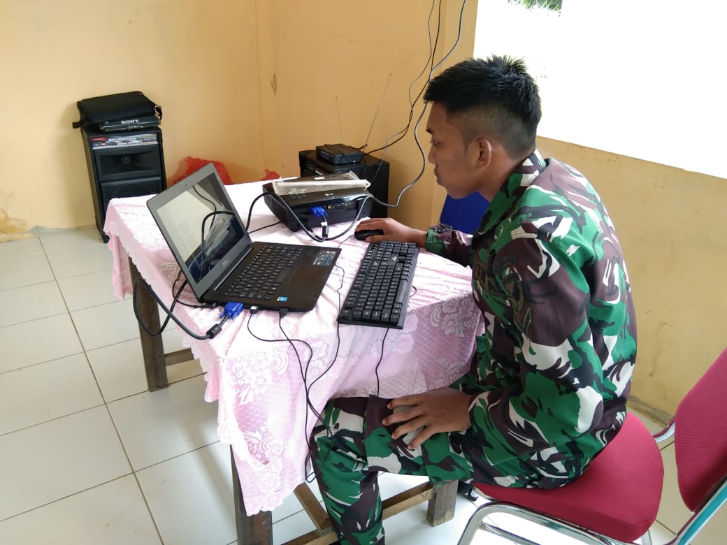 Serda Galuh Setiawan menyiapkan Paparan Untuk Penyuluhan Bela Negara Desa Sentangau Jaya