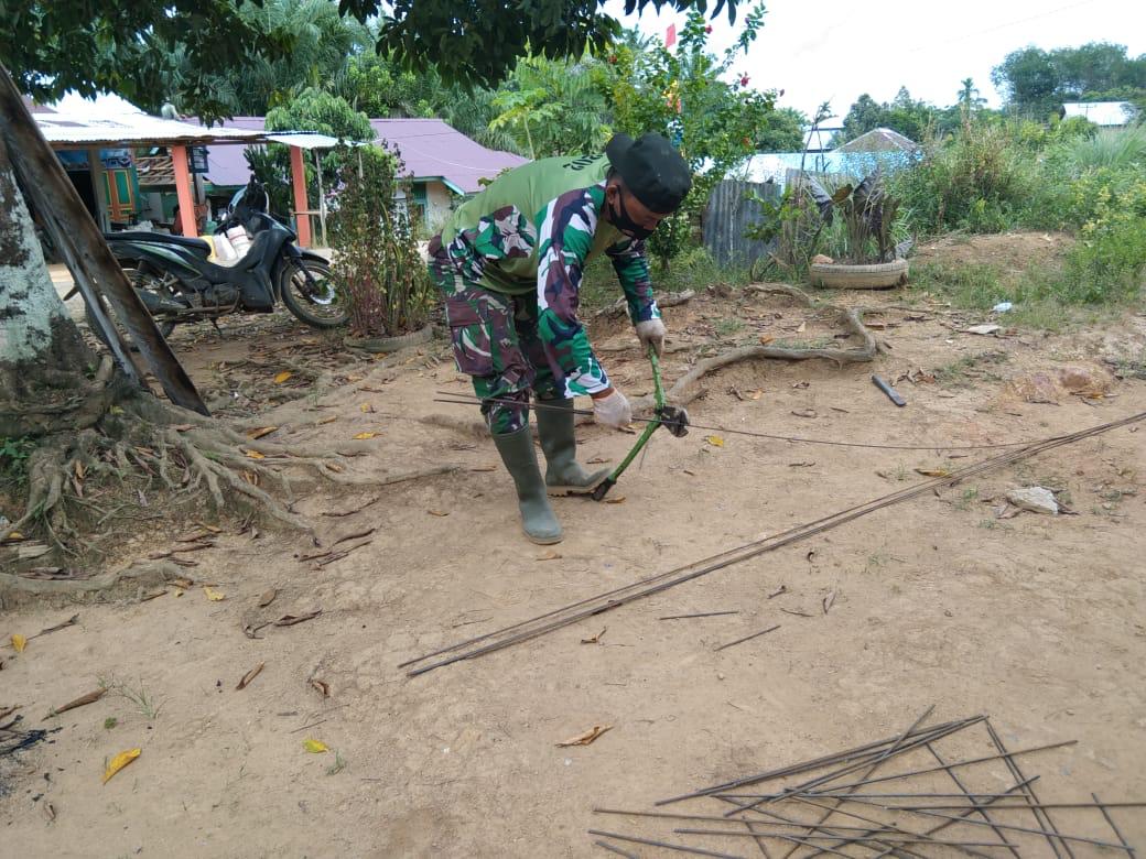 Bengkayang– Satgas Tentara Manunggal Membangun Desa (TMMD) Ke-111 Kodim 1202/Singkawang, di Desa Sentangau Jaya, Kecamatan Seluas, Kabupaten Bengkayang mulai menyiapkan bahan untuk memasang rangkaian besi untuk pengecoran pagar gereja.
