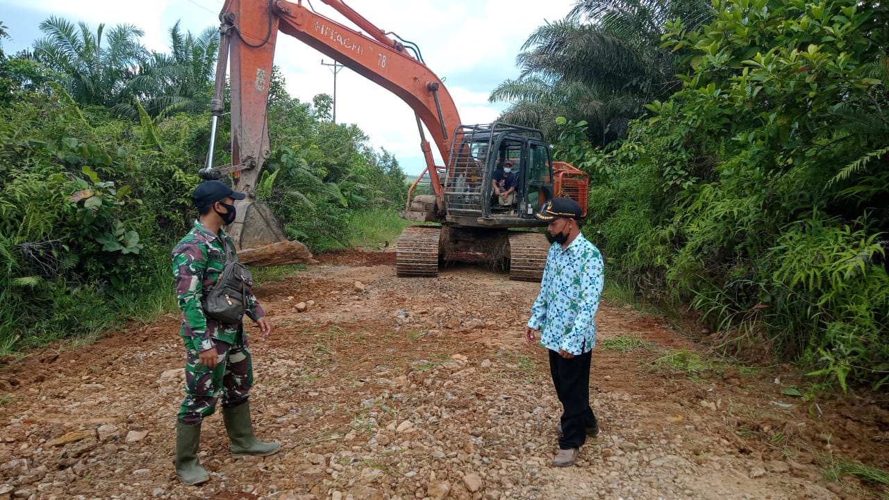 Satgas dan Excappator melakukan pengurukan tanah pada badan jalan di lokasi titik sasaran TMMD hal itu terlihat ada personil yang sedang mengawasi serta mengarahkan Excappator untuk meratakan badan jalan.